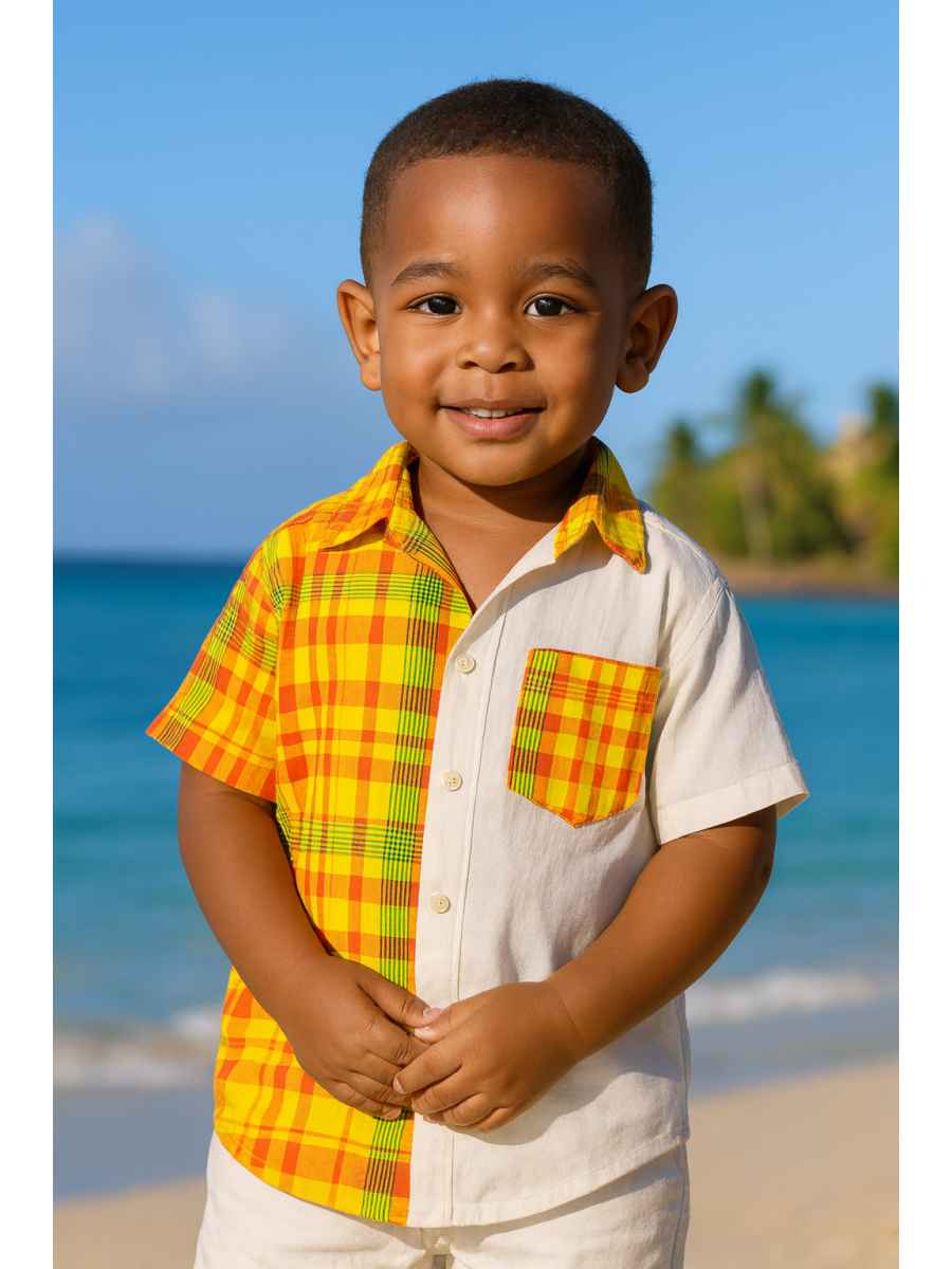 Les couleurs vivantes du madras mettent au devant cette magnifique chemise demi-manches, deux poches sur les côtés, des boutons sur le devant avec sa poche tout en madras.