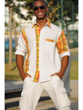 Chemise madras et coton blanc boutonnée à manches longues, col relevé et une poche sur la poitrine gauche.