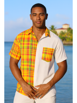 Chemise demi-manches moitié coton et moitié madras traditionnel, une poche sur un côté, des boutons sur le devant.