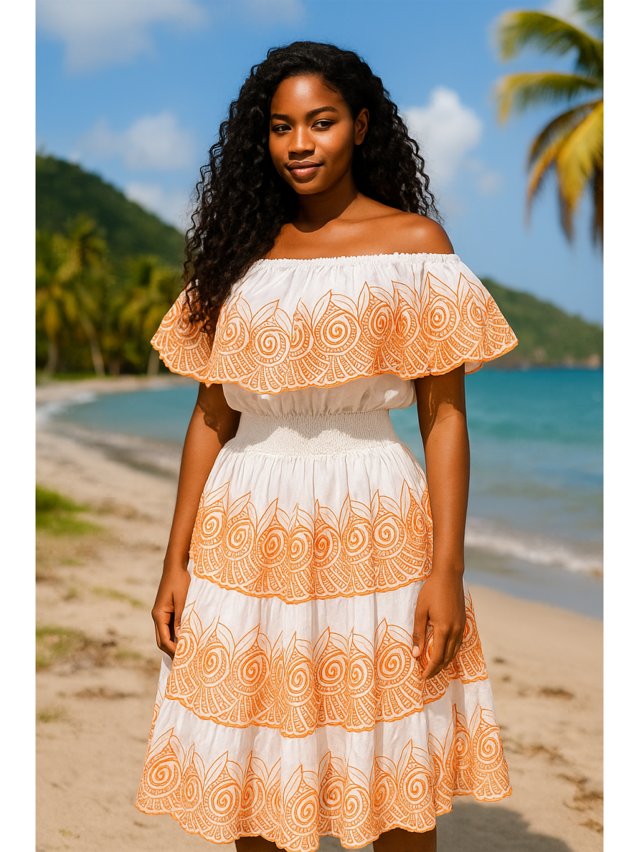 Rien n'est plus idéal qu'une tenue aussi légère et simple pour le retour des belles journées tel l'ensemble Alizée II aux couleurs vives de la collection Dody pour femmes. Cet ensemble corsage-jupe en coton uni vous offre un style antillais chic tout en restant confortable. Son joli col en bateau agrémenté d'un large volant brodé vous permet d'exposer les belles épaules nue pour ajouter un effet sexy à cet ensemble simple et élégant. La simplicité de l'ensemble Alizée vous donne la liberté de l'associer avec les accessoires de votre choix.