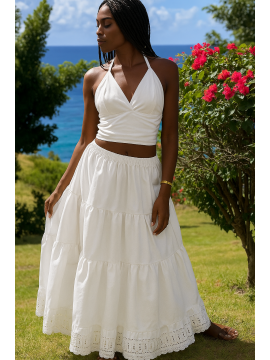La beauté antillaise extreme avec l'ensemble jupe Emma de la collection Dody pour femmes. Cet ensemble tout en coton blanc et en broderie anglaise est ce qu'il vous faut pour compléter votre garde-robe avec des ces pièces idéales à porter ensemble comme une tenue parfaite pour les sorties avec les amies par sa légèreté et son style chic originale ou à porter séparément selon votre choix.