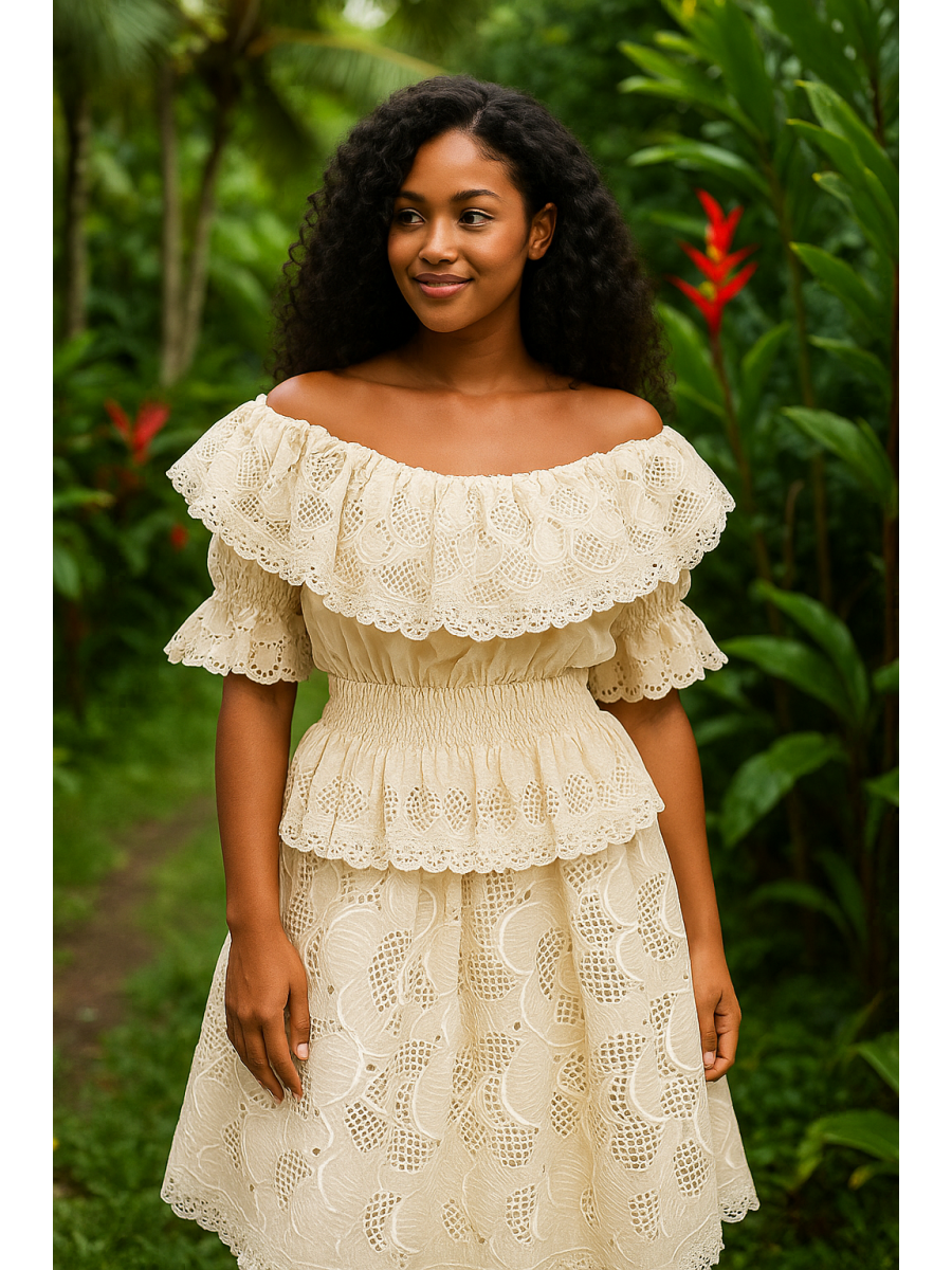 L'ensemble Frida III est à la fois original et magnifique pour compléter votre tenue créole ! L'ensemble jupe Frida III de couleur beige de la jolie collection de Dody vous offre le confort tout en restant élégante par les smocks sur la taille et son col en bateau laissant exposer les belles épaules nues pour une apparence sexy.