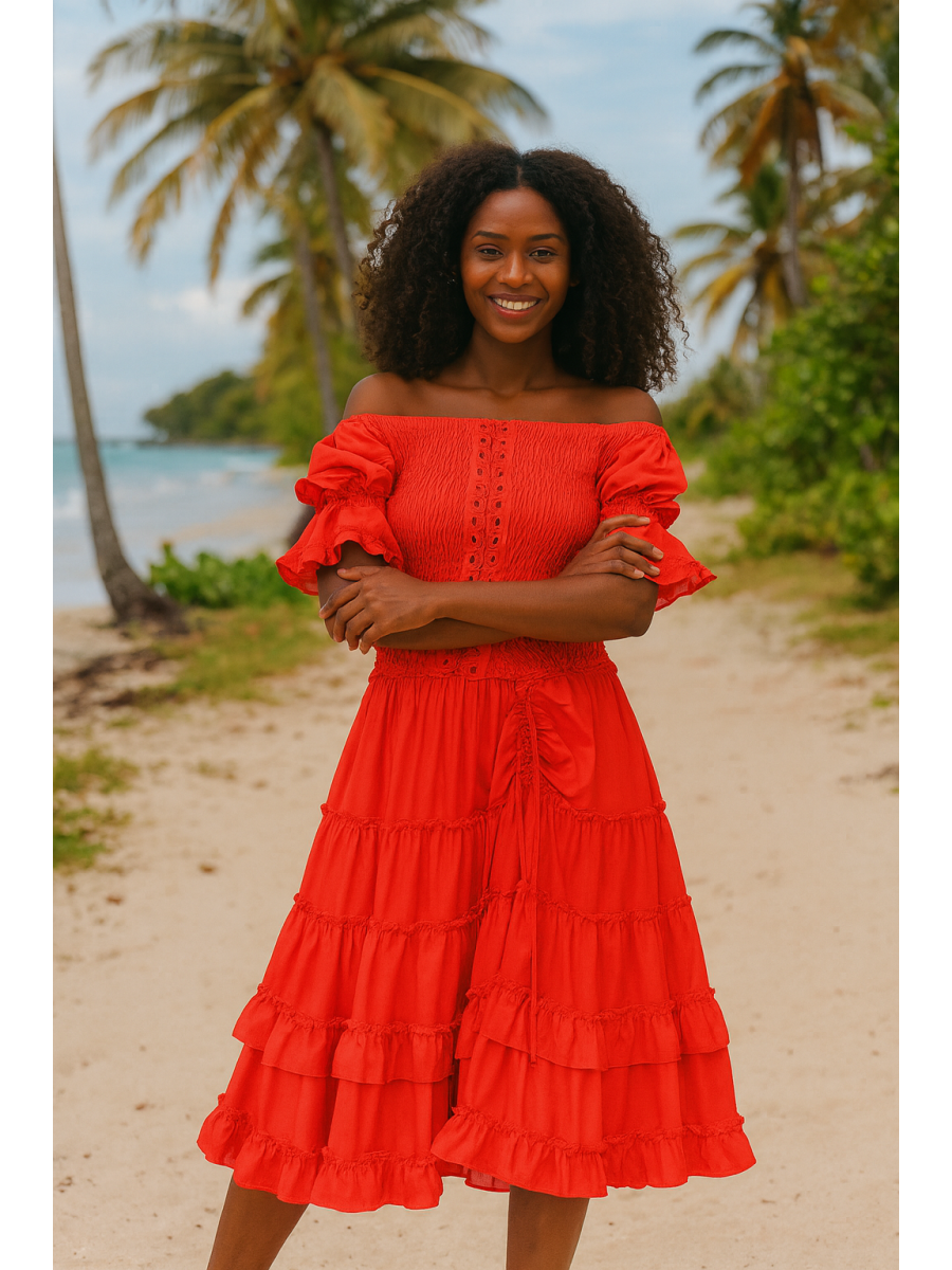 Un ensemble original et magnifique pour compléter votre tenue créole ! L'ensemble Flower de la jolie collection de Dody vous offre le confort tout en restant élégante  par les smocks sur la taille et son col en bateau laissant exposer les belles épaules nues pour une apparence sexy.