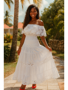 Ensemble créole. Corsage ample, col en bateau et manches trois-quarts finalisés par un large volant souligné d’un ruban de satin. Jupe longue en madras et une ceinture nouée au niveau de la taille en smocks