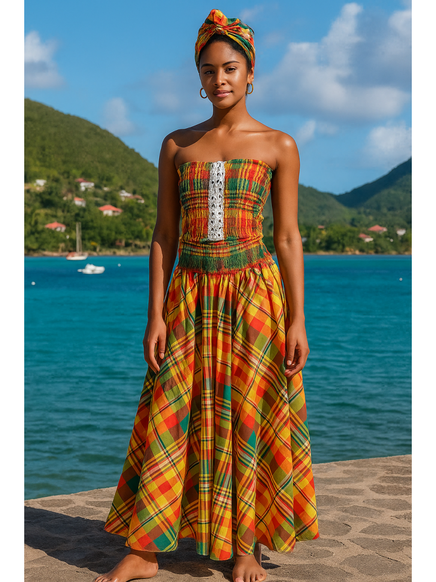 Ensemble créole. Corsage ample, col en bateau et manches trois-quarts finalisés par un large volant souligné d’un ruban de satin. Jupe longue en madras et une ceinture nouée au niveau de la taille en smocks