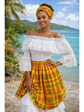Le magnifique ensemble jupe Image entièrement en Madras de la magnifique collection Dody pour femmes vient compléter votre garde-robe. Le corsage à volants peut facilement être jumelée avec une pièce de chez vous pour créer une tenue idéale a toute vos sorties avec les amies ou entre la famille.