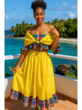 Le style chic antillais est parfaitement représenté par l'ensemble Mita entre deux coton et madras de la collection Dody pour femmes. Cet ensemble vous offre à la fois confort et élégance, porter l'ensemble Mita vous donnera une grande confiance sans devoir se sentir inconfortable par sa longue jupe en madras légèrement flotante. Le corsage en coton blanc accentue le côté féminin de cette tenue par la cordelière tout au long. Une tenue a l'apparence sexy grâce à la coupe de la tenue ressérrée à la taille par une ceinture nouée qui fait étalage a votre figure féminine.