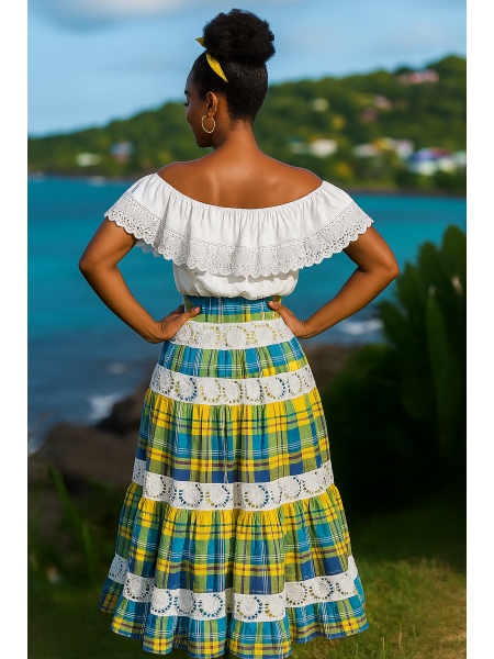 Le style chic antillais est parfaitement représenté par l'ensemble Mosaïque entre deux madras et coton de la collection Dody pour femmes. Cet ensemble vous offre à la fois confort et élégance, porter l'ensemble Mosaïque vous donnera un sentiment de légèreté flotante et une grande confiance, sans devoir se sentir inconfortable, par sa longue jupe en madras légèrement évasée.