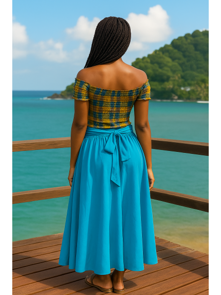 Le style chic antillais est parfaitement représenté par l'ensemble Tessy entre madras et coton de la collection Dody pour femmes. Cet ensemble vous offre à la fois confort et élégance, porter l'ensemble Tessy vous donnera un sentiment de légèreté flottante et une grande confiance, sans devoir se sentir inconfortable, par sa longue jupe en madras légèrement évasée.