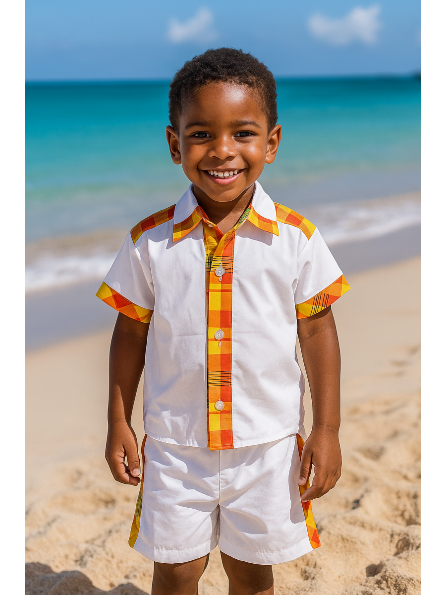 L'originalité et la finition de ce magnifique ensemble short en coton-madras comprenant deux poches sur les côtés et une poche au niveau de la chemise.