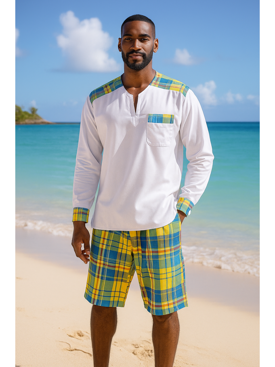 La magnifique tenue bermudas avec poches "Jungle" mélange entre coton et Madras.