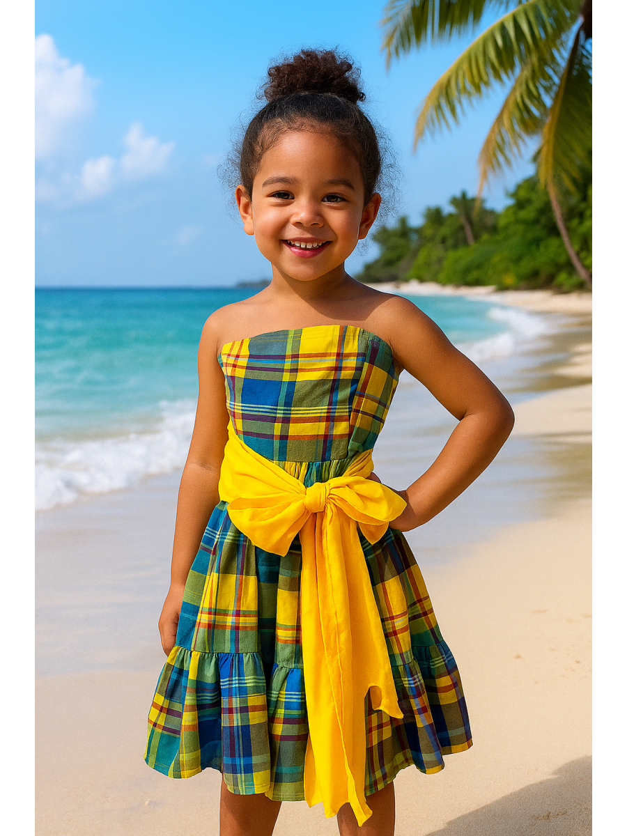 Le style classique antillais est représenté par la robe Loisir en madras de la collection Dody pour filles. Cette robe Loisir est juste ce qu'il vous faut pour tout évènement en famille ou une sortie avec les amies grâce à sa légèreté et sa coupe flatteuse. L'originalité de cette robe réside dans sa texture entre madras et coton.