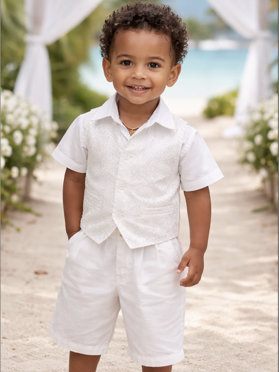 La magnifique tenue bermuda avec poches "Geovany" mélange entre coton et un gilet en broderie anglaise.