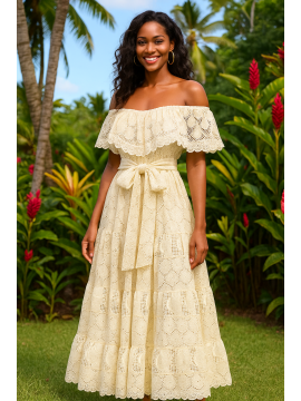 La simplicité et l'originalité sont les meilleures caractéristiques de ce vêtement créole de la collection pour femmes de Dody. Citrouille en broderie anglaise de couleur beige vous offre l'élégance grâce à son long volant. Vous vous sentirez confiante en portant la robe Régina à l'apparence sexy.