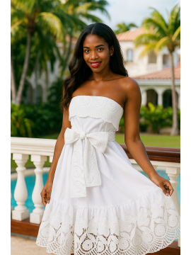 La fusion de mode et de confort dans la robe créole Hilary de Dody ... En bustier charmant la nudité des épaules, évasée, ajustée à la taille par des smocks sur le dos et une ceinture fantaisiste nouée au-dessous de la poitrine.