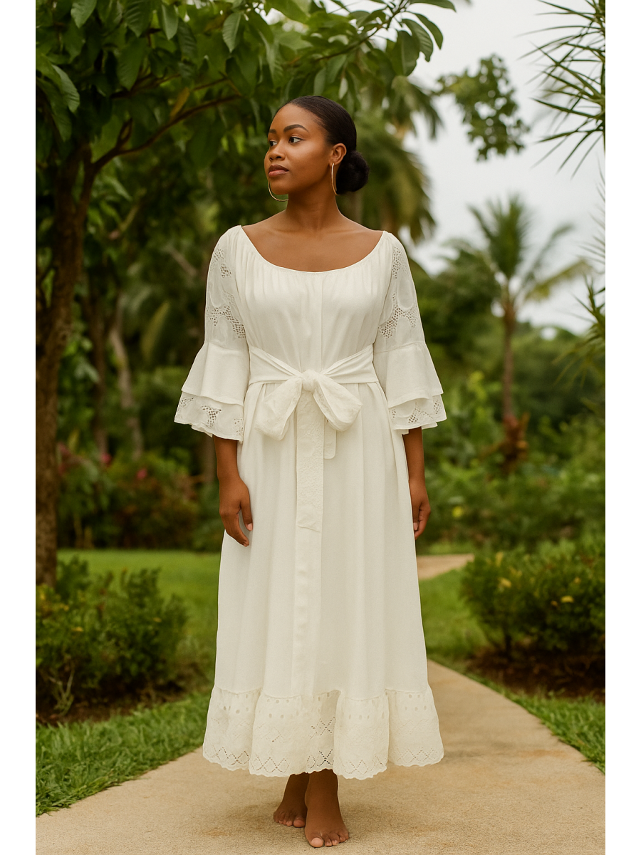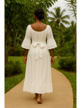 Vêtement Martinique en broderie : col en bateau soulignant le charme des épaules, finies en volant depuis le coude, ceinture nouée à la taille pour plus de forme, boutonnée devant.