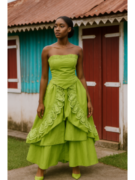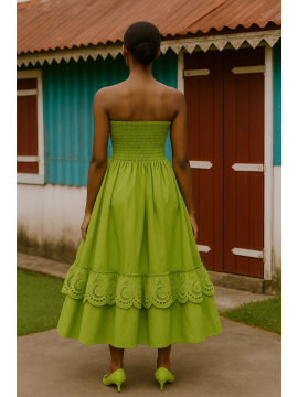 Il n’y a rien de plus parfait pour célébrer les évènements d’été qu’avec une robe si légère, élégante et confortable. Cette longue robe verte en coton orné de broderie anglaise à l'apparence sexy est juste ce qu’il vous faut pour attirer l’attention. Une telle robe décolletée, permettant de montrer les belles épaules, accentue le côté féminin grâce à sa coupe super originale fendue devant et finalisée par un volant brodé en bouton d’or pour un effet spéciale et unique. Ce modèle de robe peut facilement être jumelé avec des accessoires et des talons.