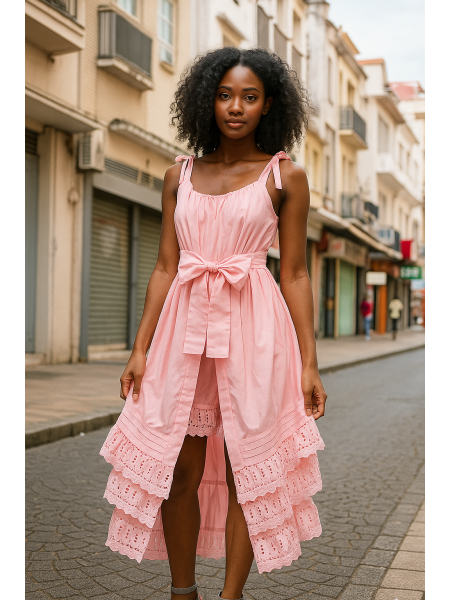 Robe en Broderie créole du style antillais. Coupe courte du devant et longue du derriere