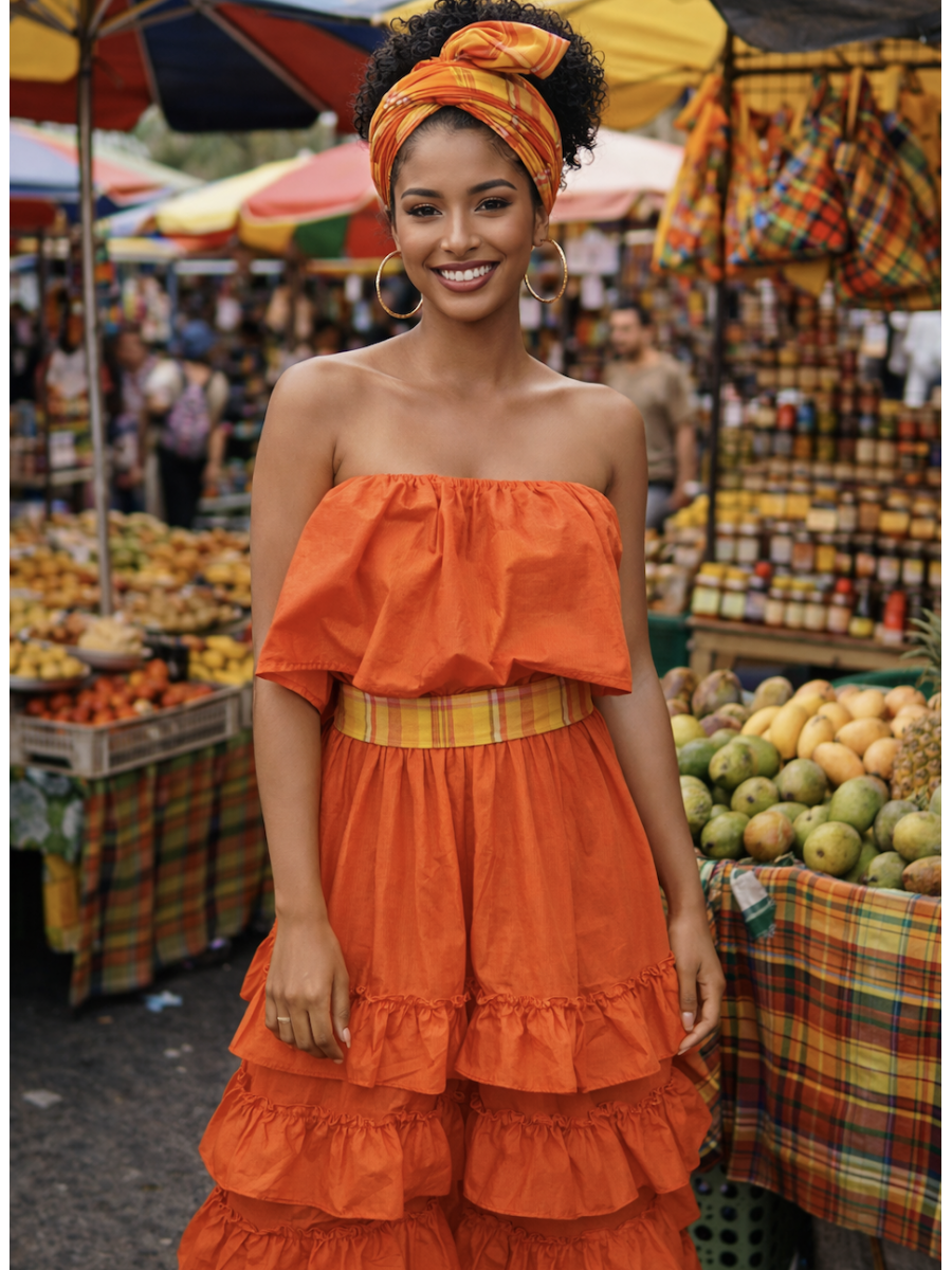 La fusion de mode et de confort dans la robe créole Suzy de Dody ... En bustier charmant la nudité des épaules, évasée, ajustée à la taille par des smocks sur le dos et une ceinture en madras nouée. Réalisée en coton avec des froufrous en coton sur le haut et le bas.