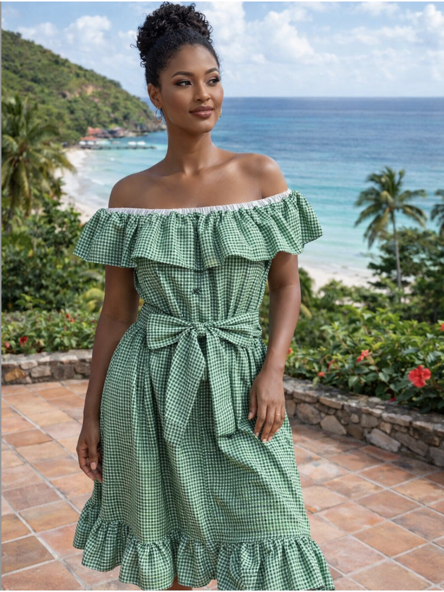 Voilà une adorable robe créole facile et pratique qui permet de se vêtir à l’antillais tout en offrant confort et allure féminine. Robe longue et ample, col en bateau.