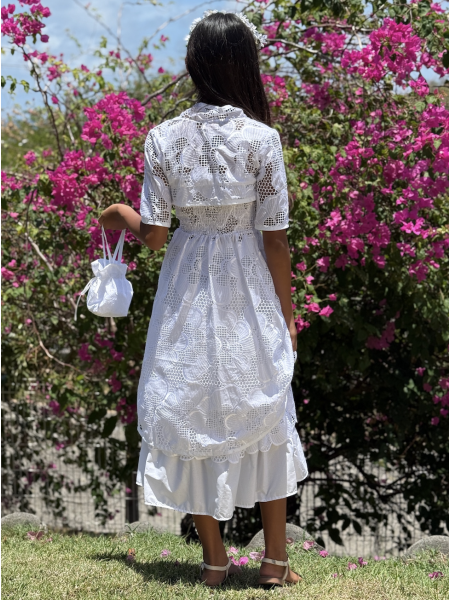 "Célébrez la première communion avec élégance grâce à cette robe en coton pur agrémentée de broderie anglaise sophistiquée en forme d'hibiscus. Cette pièce unique allie tradition et modernité, parfaite pour créer des souvenirs précieux lors de cette cérémonie religieuse."