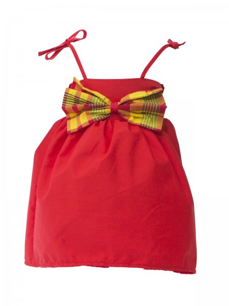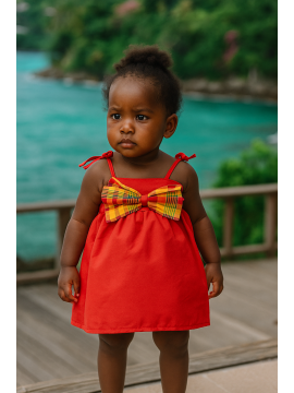 Simple robe longue, à fines bretelles réglables et au buste smocké tout autour. Noeud papillon au niveau de la taille.
